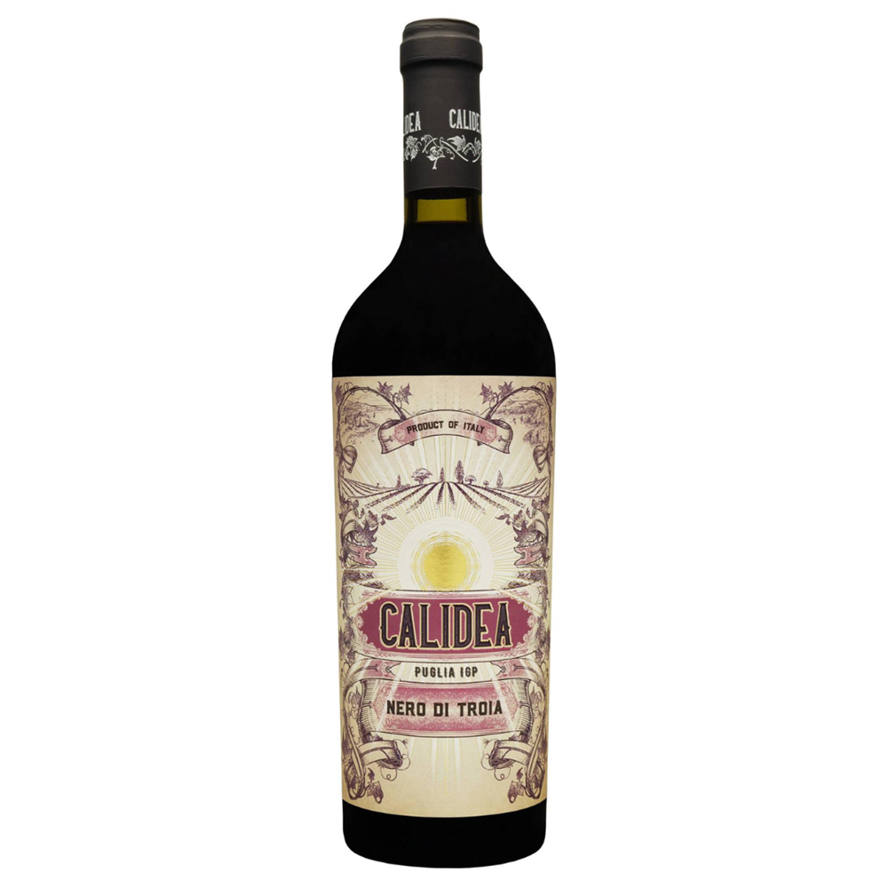 Calidea Nero Di Troia Puglia IGP 2021 dry red wine has a deep, rich ruby color with violet hues. The aroma reveals notes of black berries and spices, along with subtle hints of vanilla and oak. The flavor is soft and balanced. It pairs perfectly with red meat, grilled dishes, pasta, and aged cheeses.